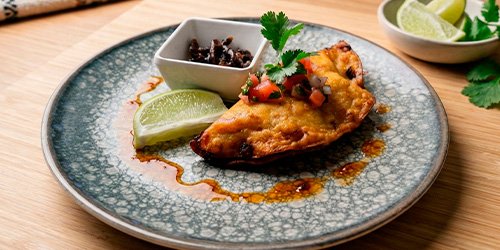 Plátano macho frito hasta lograr textura caramelizada por fuera y suave por dentro. Dulce natural con alma mexicana Lechera / Azúcar / Cajeta.