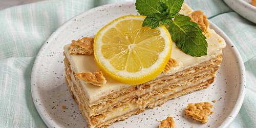 Capas de galleta suave y crema cítrica de limón, fresca y equilibrada entre dulzor y acidez.