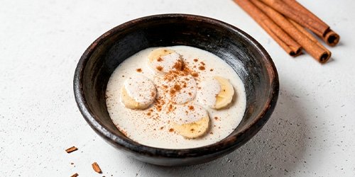 Plátano servido con crema dulce casera y toque suave de vainilla. Simple, nostálgico y adictivo.