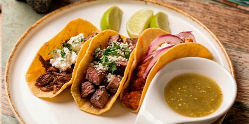 3 tacos preparados al momento con carne a elegir: chorizo / carne enchilada / arrachera.