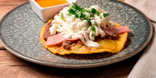 2 Tostadas crujientes con base de frijoles refritos, de tinga o jamón y queso fresco, salsa de la casa, nata acida.